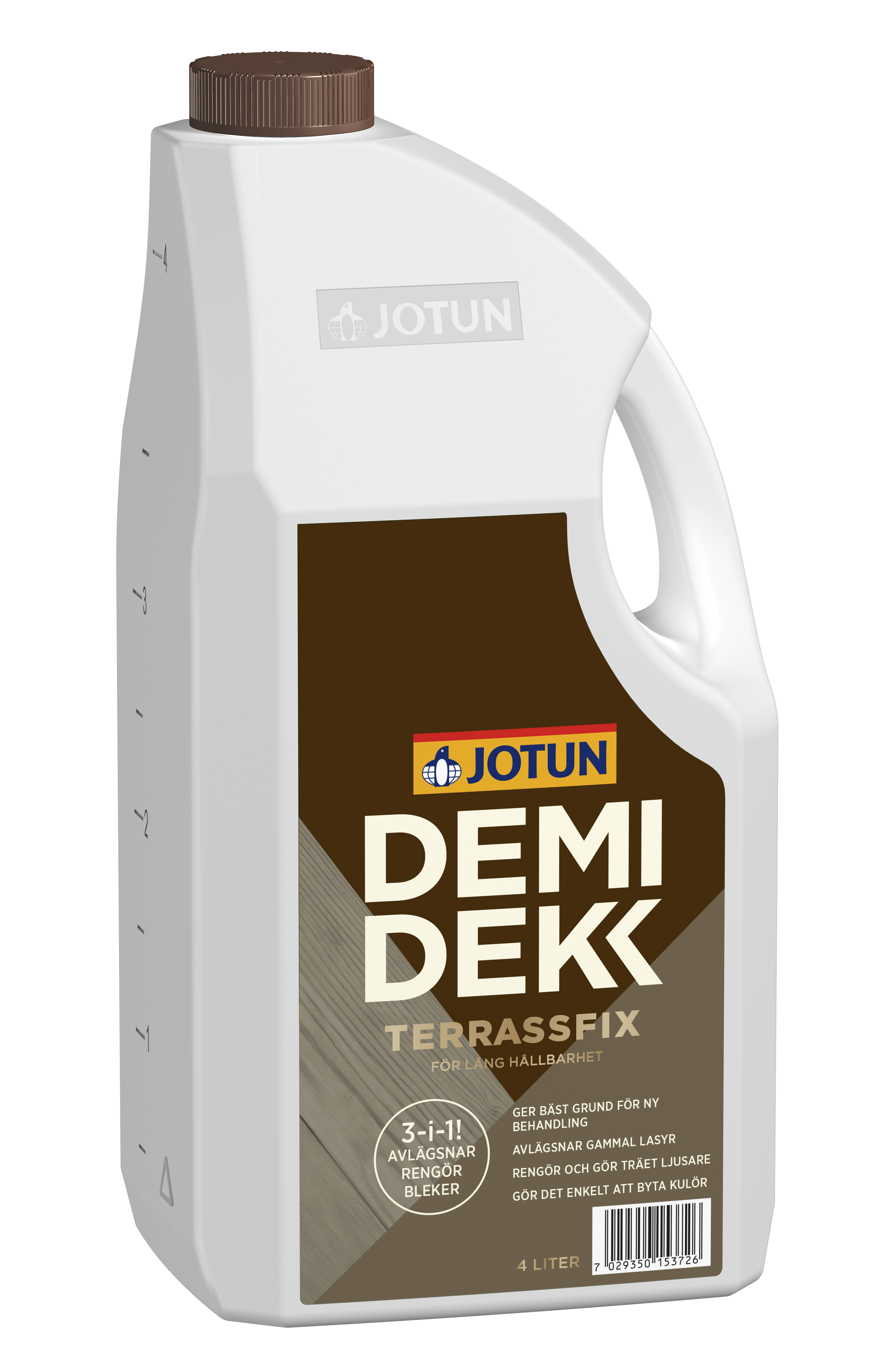Nettoyant biodégradable spécial pour les terrasses en bois. Un produit 3 en 1 : Dégrise – Décrasse – Dilate les pores du bois pour favoriser l’accrochage des produits de traitement / finition (ex. DEMIDEKK TERRASSLASYR ou TREOLJE)